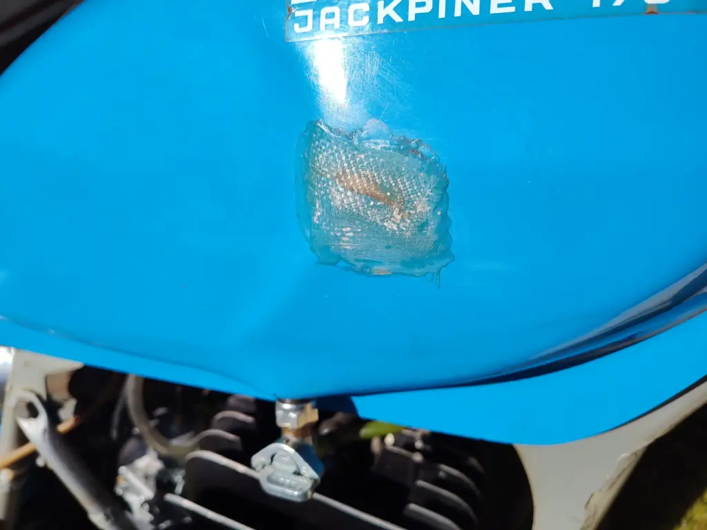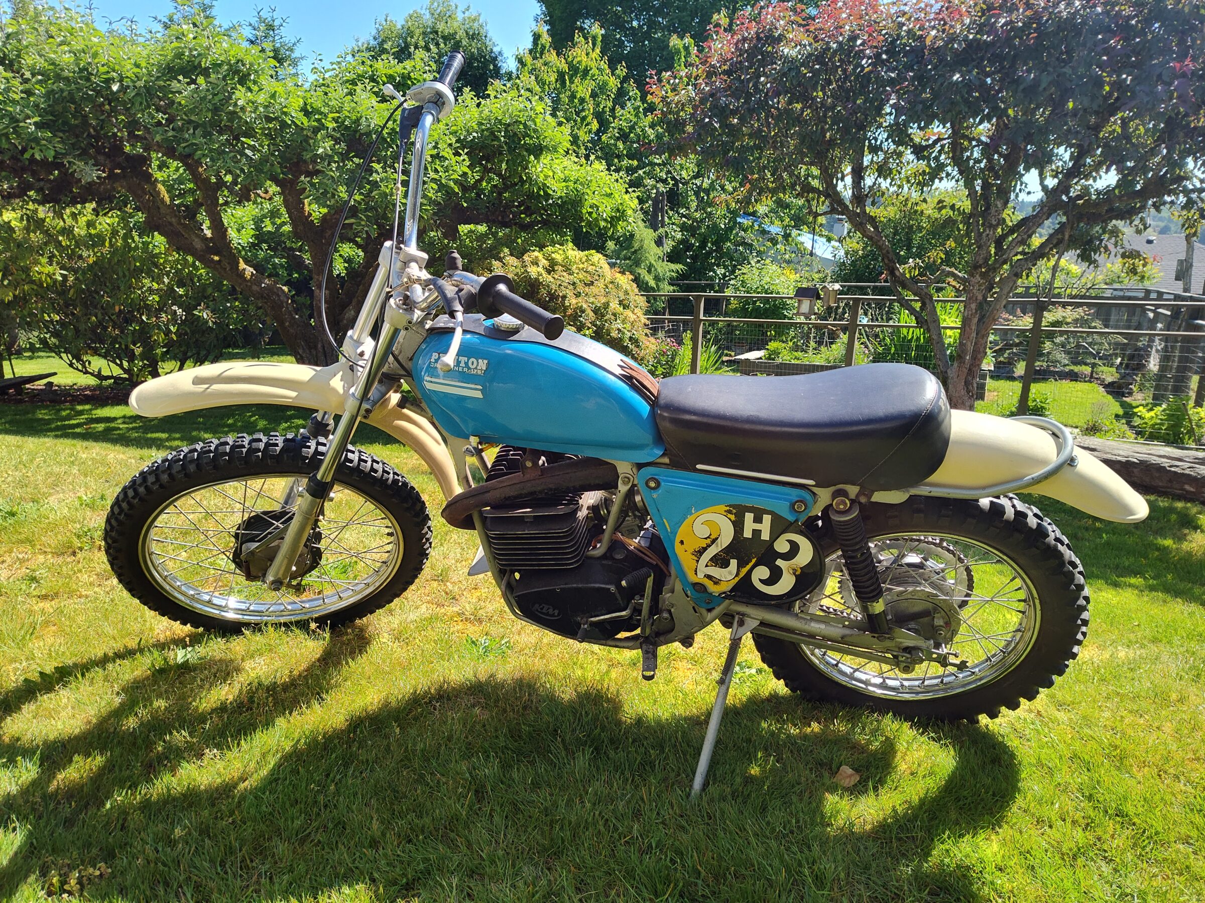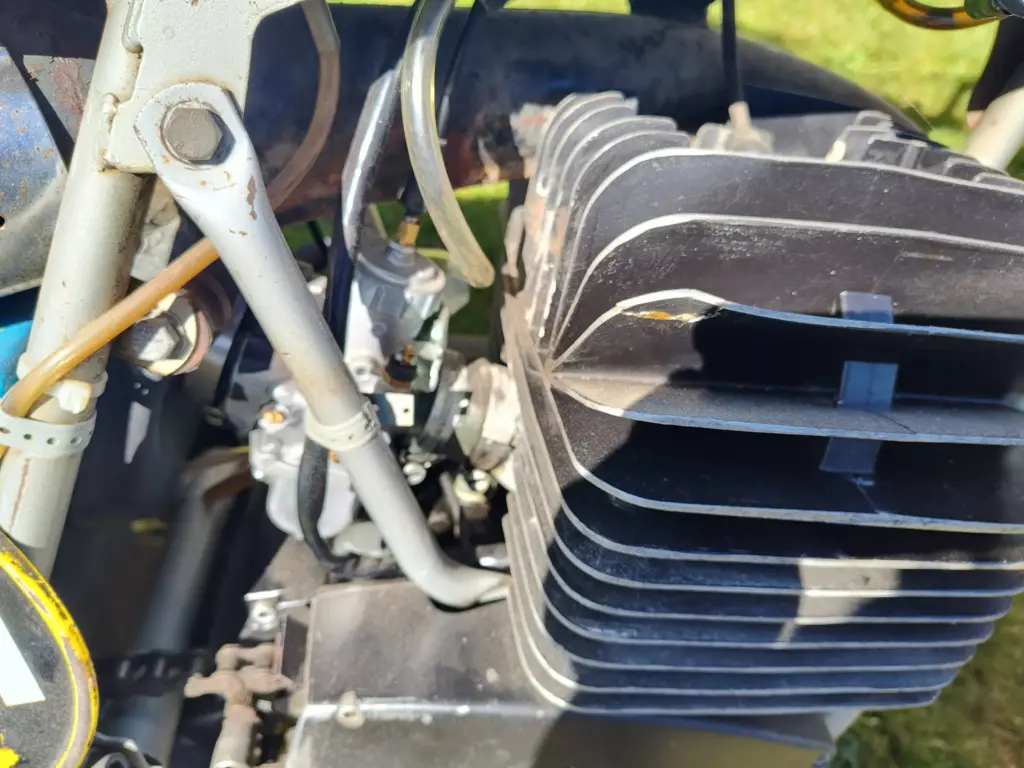 This is a nice survivor. Except for replacing the carb, I am trying not to do much of anything to the bike. Has a bent cooling fin and a hole in the tank that someone patched. Runs great!